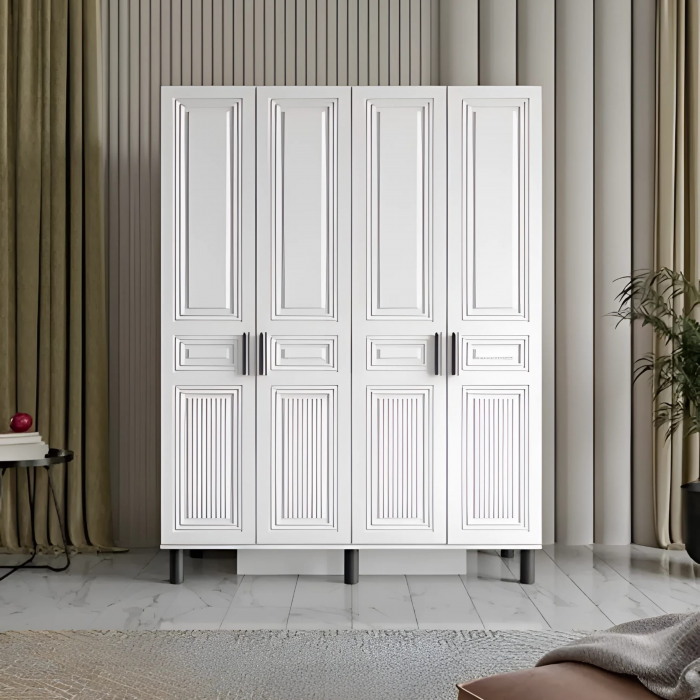 MDF malzemeden üretilmiş bu dört kapaklı gardırop, sade renk paleti ve zarif detaylarıyla modern yaşam alanlarına sofistike bir dokunuş kazandırır. Tamamı mat beyaz renkte tasarlanmış dolap kapakları, klasik dikdörtgen panellerle hareketlendirilmiş olup yüzeydeki ince çizgisel desenler ürüne derinlik kazandırır. Orta bölümdeki tam boy ayna, hem pratik bir kullanım hem de ferahlık hissi sağlar. Geniş iç hacmi, kıyafet ve aksesuarlar için ideal bir depolama alanı sunarken, siyah metal kulplar ve ayaklar modern kontrastı güçlendirir.