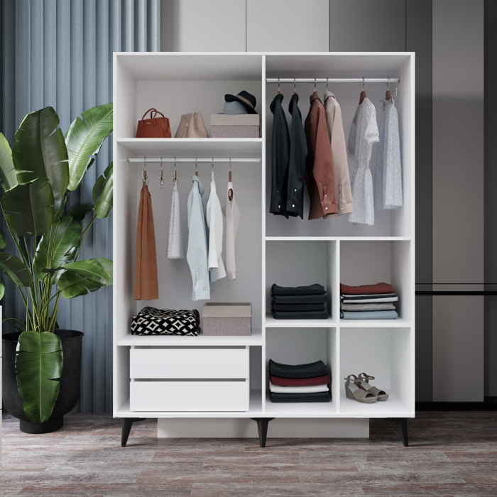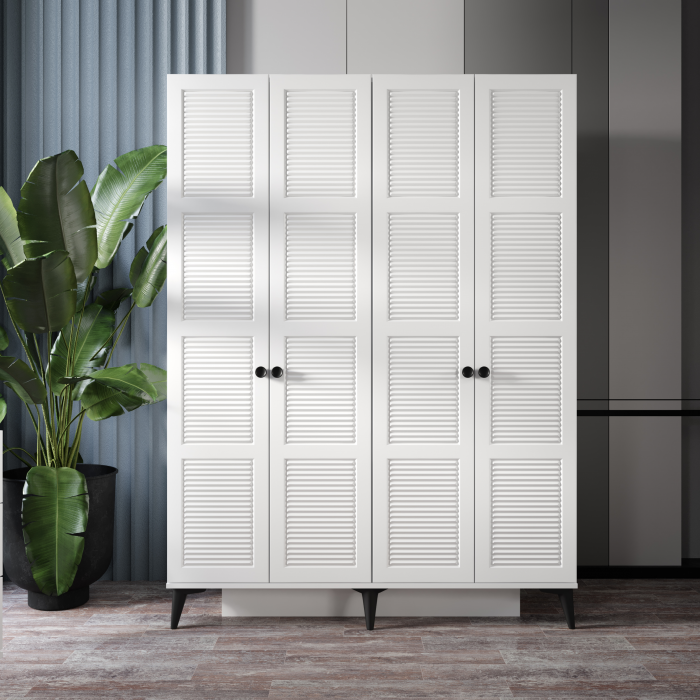 MDF malzemeden üretilmiş bu dört kapaklı gardırop, sade tasarımıyla modern ve ferah mekânlara zarif bir uyum sağlar. Gövdesinde kullanılan mat beyaz ton, ortama aydınlık bir etki kazandırırken, kapaklardaki panjur formundaki yatay çizgiler ürüne karakteristik bir görünüm kazandırır. Siyah metal kulplar ve ayaklar, beyaz gövdeyle güçlü bir kontrast oluşturarak çağdaş bir denge yaratır. Geniş iç hacmi sayesinde düzenli bir depolama alanı sunarken, tasarımıyla hem şehirli hem doğal bir tarz yakalar.