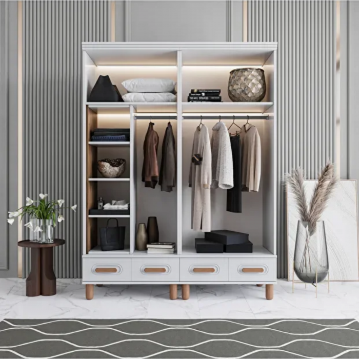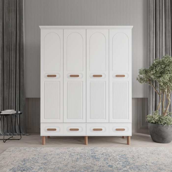 MDF malzemeden üretilmiş bu dört kapaklı gardırop, zarif detayları ve doğal ton uyumuyla yaşam alanlarına ferahlık kazandırır. Gövdesinde kullanılan mat beyaz renk, temiz ve sade bir görünüm sunarken; kulp, ayak ve üst tabla kısmında kullanılan açık meşe tonları, tasarıma sıcak bir dokunuş katar. Kapaklardaki kavisli çizgisel yüzeyler, dolaba zarif bir derinlik kazandırır. Alt bölümde yer alan üç çekmece, estetik oval kulplarıyla hem görsel bütünlük hem de fonksiyonel kullanım sağlar.