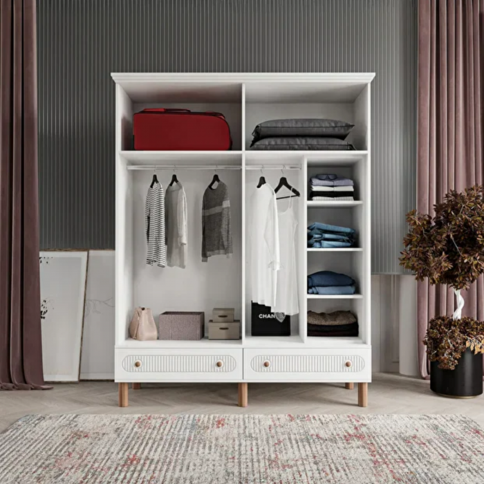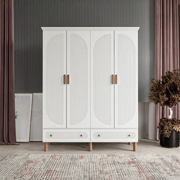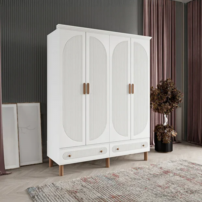 MDF malzemeden üretilmiş bu dört kapaklı gardırop, zarif tasarımıyla estetik ve işlevselliği bir araya getirir. Gövdesinde kullanılan mat beyaz renk, ferah ve sade bir atmosfer oluştururken, kapaklardaki oval formda dikey çizgisel detaylar ürüne modern bir dokunuş kazandırır. Üst tabla, ayaklar ve kulplarda kullanılan açık meşe tonları, beyaz yüzeyle mükemmel bir uyum sağlayarak sıcak bir kontrast yaratır. Alt kısımda yer alan iki çekmece, hem dekoratif görünümü hem de ek depolama alanı ile dolabın bütünlüğünü tamamlar.