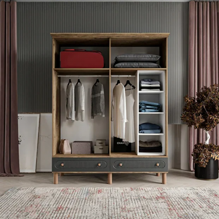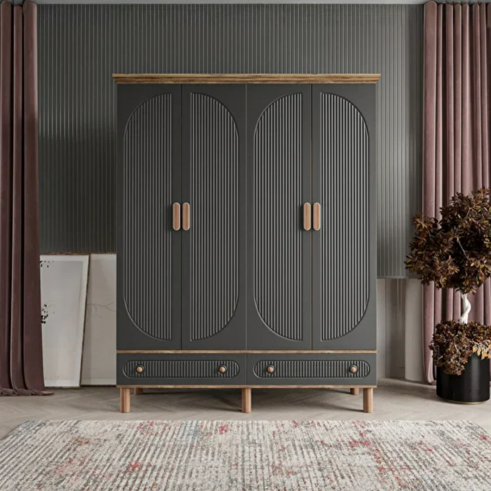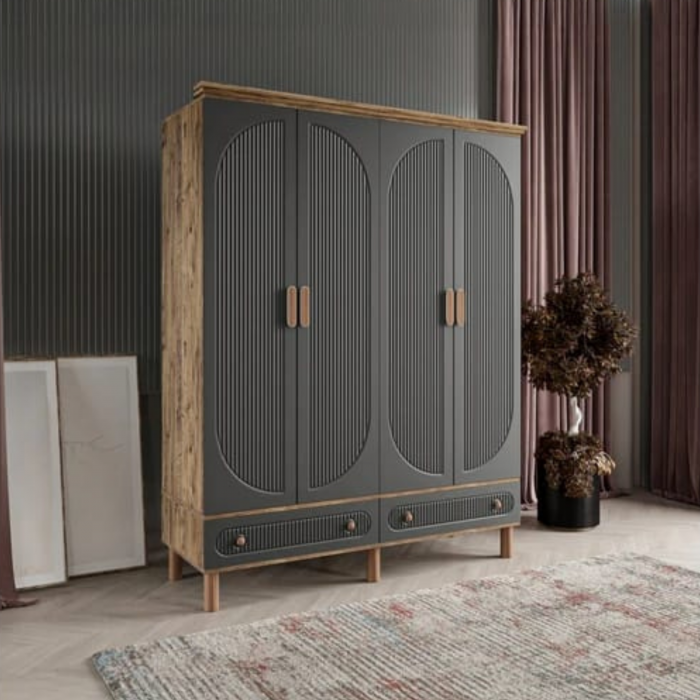 MDF malzemeden üretilmiş bu dört kapaklı gardırop, modern tasarımı ve sıcak ton geçişleriyle dikkat çeker. Kapaklarda kullanılan siyah ton, sofistike bir görünüm sunarken; gövde ve üst tabloda tercih edilen doğal ceviz kaplama, tasarıma sıcaklık ve doğallık kazandırır. Kapak yüzeyindeki dikey çizgisel detaylar ve kavisli formlar dolaba zarif bir ritim kazandırırken, alt bölümde yer alan iki çekmece, oval hatlı ahşap kulplarıyla hem estetik hem de pratik bir kullanım sunar.